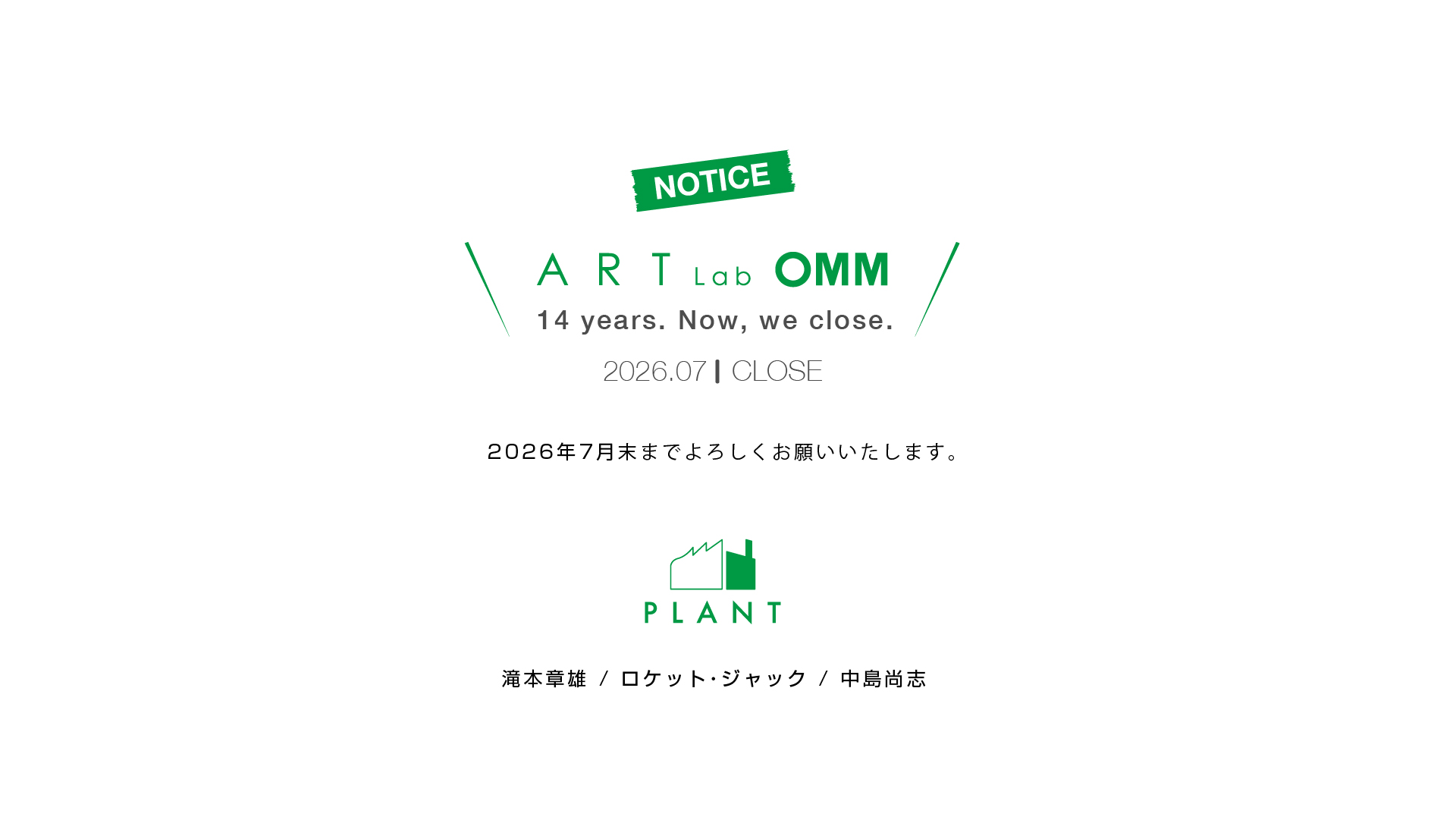 約14年という時間は、作家のみなさまが大きく活躍の場を広げていく中、同じくスペースが担う役割も大きく変化し、オープン当初にコンセプトとしていました「若手アーティストのインキュベーション」から次の展開へと進むには良いタイミングなのかもしれません。現在の運営メンバーである滝本章雄、ロケット・ジャック、中島尚志の3名も、ここ数年で活動の範囲が広がってきており、一度このタイミングでじっくり次に進む為の準備をする時間を頂きたいと思っております。